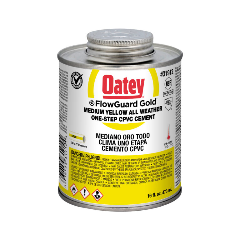 Oatey® FlowGuard Gold® 1-Step All Weather Fast Set Yellow Cement wird für Kaltwassersysteme und Warmwassersysteme bis zu 93°C empfohlen. Seine vorbeugende Formel wurde entwickelt, um Rohre vor Korrosion zu schützen. Der mittelstarke Zement hat hervorragende spaltfüllende Eigenschaften und lässt sich mit dem mitgelieferten Deckelspachtel leicht auftragen. Dieser gelbe, schnell abbindende Zement mit niedrigem VOC-Gehalt kann zum lösungsmittelbasierten Schweißen von Kupferrohren (CTS), CPVC-Heiß- und Kaltwasserrohren und Fittings bis zu einem Durchmesser von 2 Zoll mit Presspassung verwendet werden. Oatey-Produkte genießen seit über 100 Jahren das Vertrauen von Sanitärfachleuten.