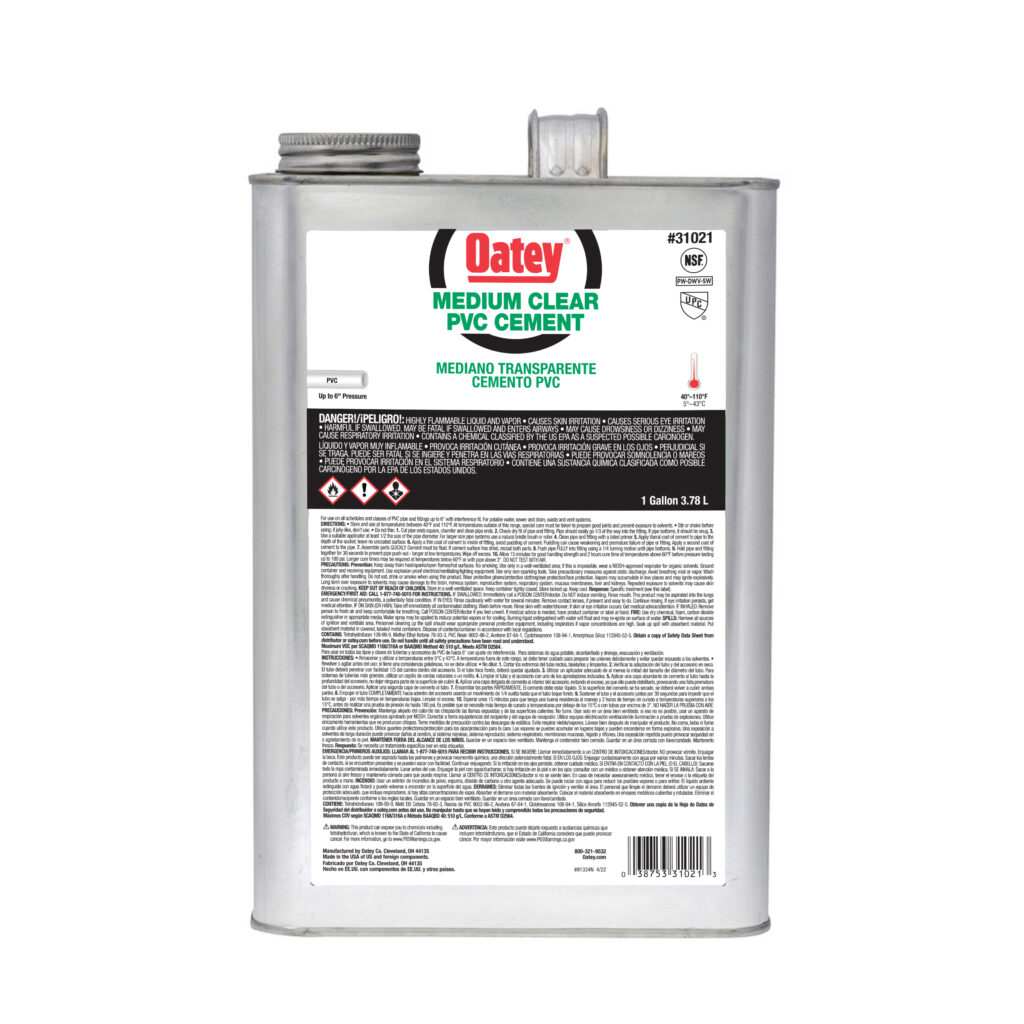 Oatey® PVC Medium Bodied Fast Set Clear Cement wird für DWV, Druckleitungen, Trinkwasser und elektrische Anwendungen empfohlen. Der mittelstarke Zement hat hervorragende spaltfüllende Eigenschaften und lässt sich mit dem mitgelieferten Pinsel leicht auftragen. Dieser klare, schnell abbindende Zement kann zum lösungsmittelbasierten Schweißen aller Arten und Klassen von PVC-Rohren und -Formteilen bis zu einem Durchmesser von 6 Zoll mit Presspassung verwendet werden. Oatey-Produkte genießen seit über 100 Jahren das Vertrauen von Sanitärfachleuten.